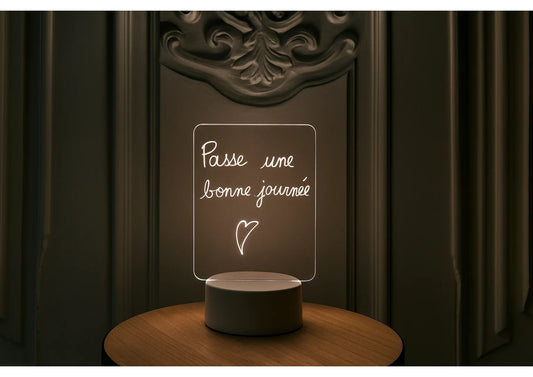 Il suffit de brancher le câble USB fourni (sur un ordinateur, une prise USB ou un adaptateur secteur) pour que la base s’illumine et fasse briller vos messages. Vous pouvez écrire sur la plaque avec le feutre effaçable inclu.